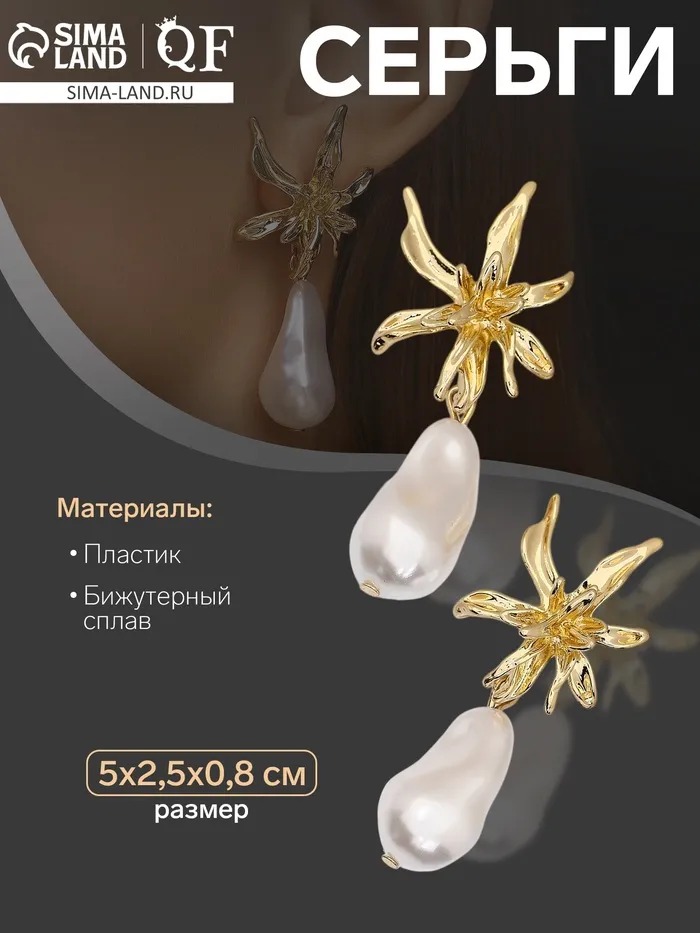 Серьги с жемчугом «Бусина» груша с цветком, цвет золото — Характеристики