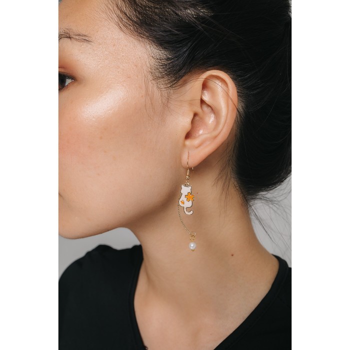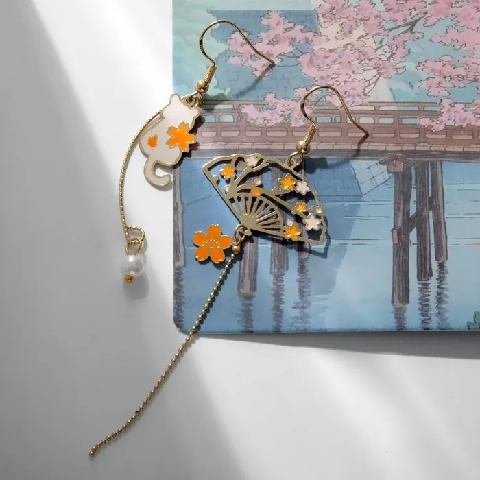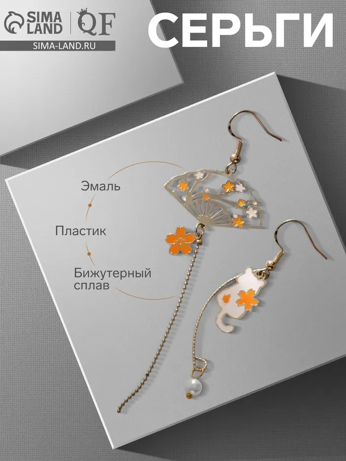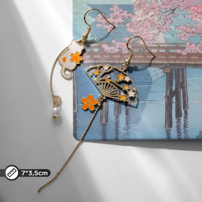 Серьги с жемчугом «Япония» веер и кот в цветах, цвет оранжево-белый в золоте — Характеристики