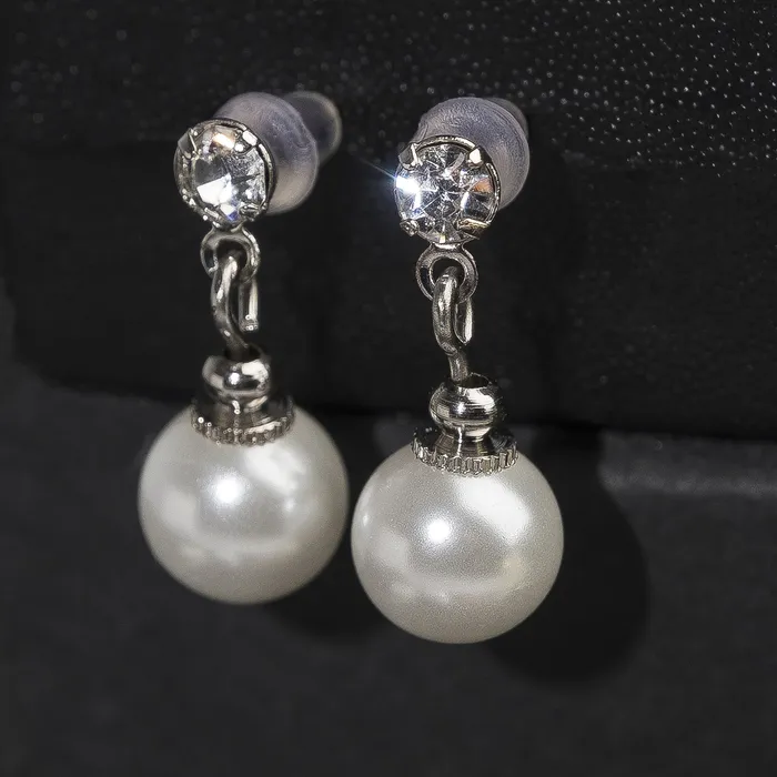 Изящные серьги с искусственным жемчугом и сверкающими стразами создают неповторимый образ, идеально подходящий для особенных событий и повседневной элегантности. Длина 2,8 см и серебристая фурнитура гармонично сочетаются с белоснежными бусинами диаметром 1 см, придавая украшению лёгкость и утонченность.