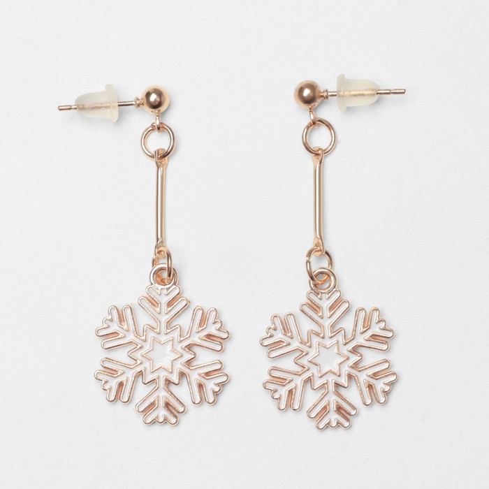 Нежные серьги длиной 4 см воплощают атмосферу зимней сказки, сочетая блеск золотистого металла и морозную белизну эмали в изящном дизайне снежинок. Лёгкое украшение с застёжкой-пусет создает ощущение лёгкости и комфорта, идеально дополняя праздничный образ девочки, подчеркивая её нежность и игривость.