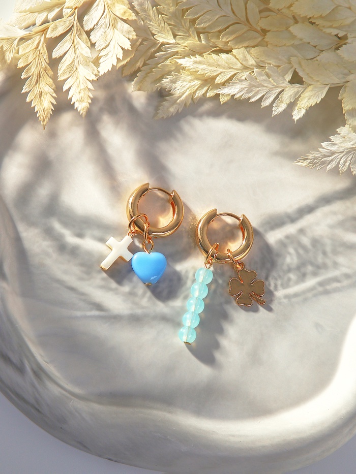 Металлическое основание с золотым покрытием гарантирует долговечность и устойчивость к износу, а застёжка-конго обеспечивает надёжную фиксацию и удобство в использовании. Вставки из пластика насыщенных синих и голубых оттенков придают серьгам свежесть и современный вид, подчёркивая символику и обереговую тематику украшения.