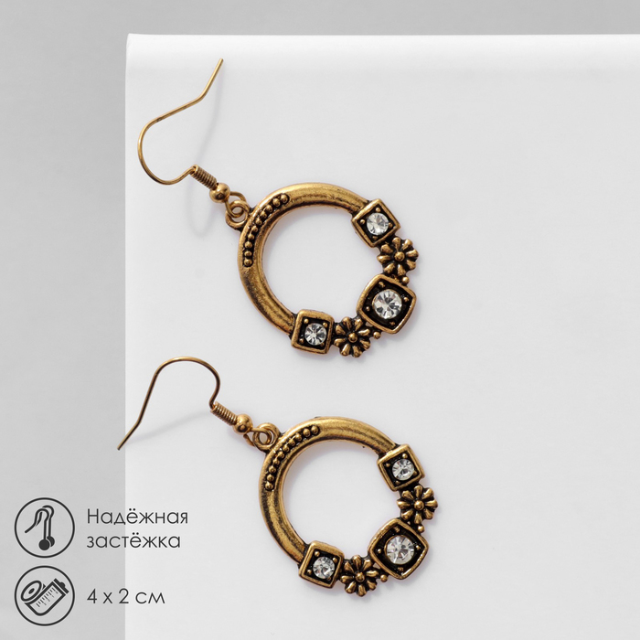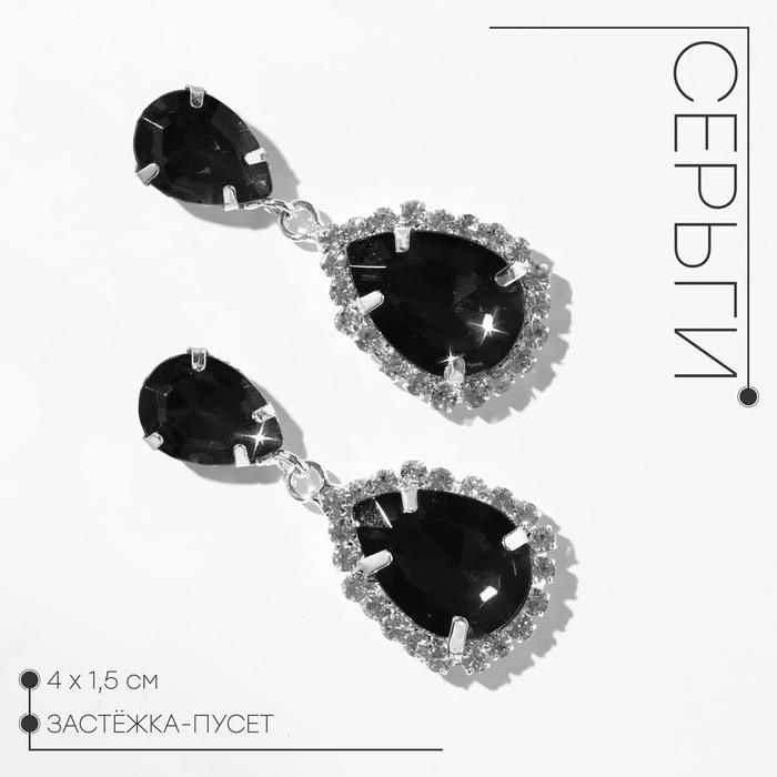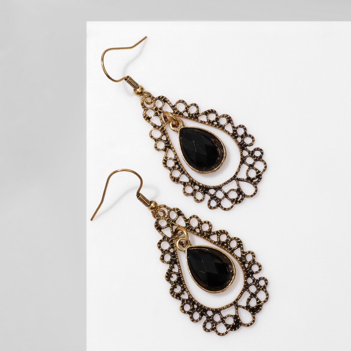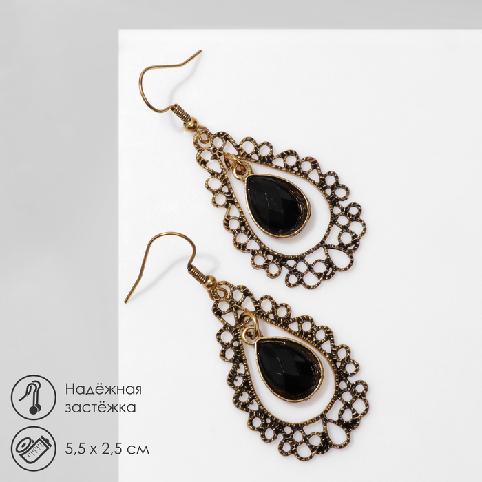 Серьги со стразами «Ажур» капля, цвет чёрный в чернёном золоте — Характеристики