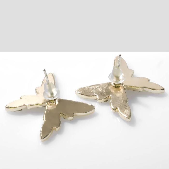 Эти изящные маленькие серьги-бабочки подарят вашей внешности очаровательную нотку весенней свежести. Акцент на деталях сделан с использованием белых кристаллов-страз, заключенных в золотую оправу из металла, что создает приятное впечатление дорогого украшения. Удобная застежка-гвоздик гарантирует надежную посадку даже при активном образе жизни.