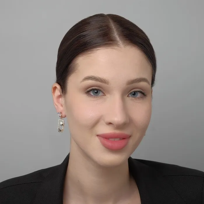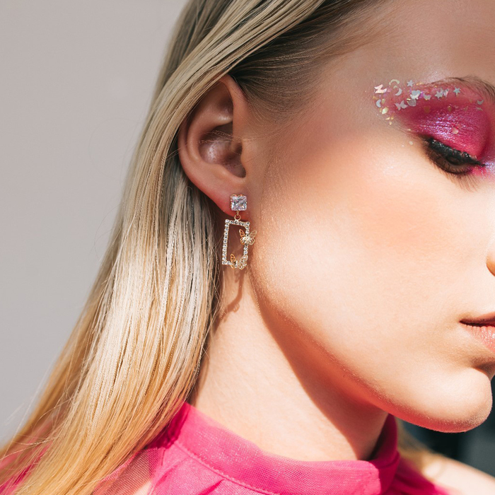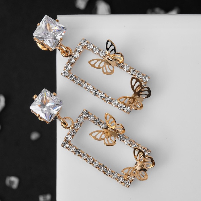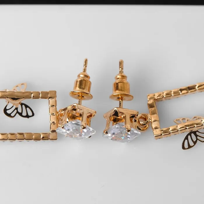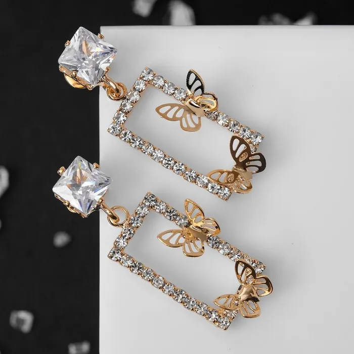 Серьги со стразами «Порхай» бабочки в прямоугольнике, белые в золоте — Характеристики