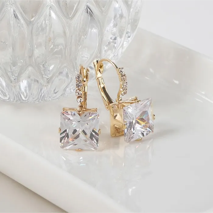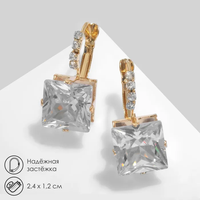 С длиной всего 2,4 см и квадратной формой, они прекрасно вписываются в любой наряд, будь то вечерний выход или деловая встреча. Золотая фурнитура, в сочетании с белыми стразами, придаёт серьгам роскошный вид, который сияет и притягивает взгляды. Застёжка-левербек обеспечивает надежность и комфорт, позволяя вам наслаждаться каждым моментом, не беспокоясь о том, что украшение может потеряться.