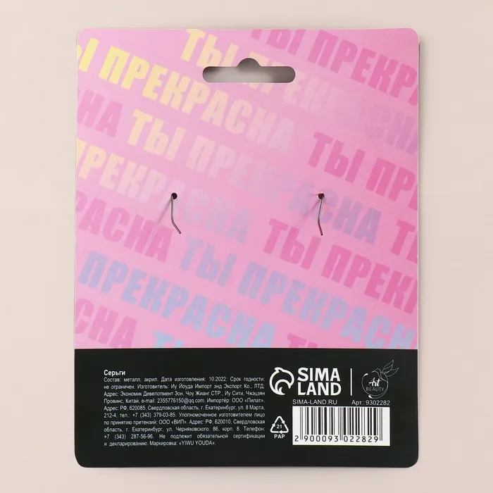 Серьги выполнены из акрила и бижутерного сплава, которые прослужат вам безопасно и долго.