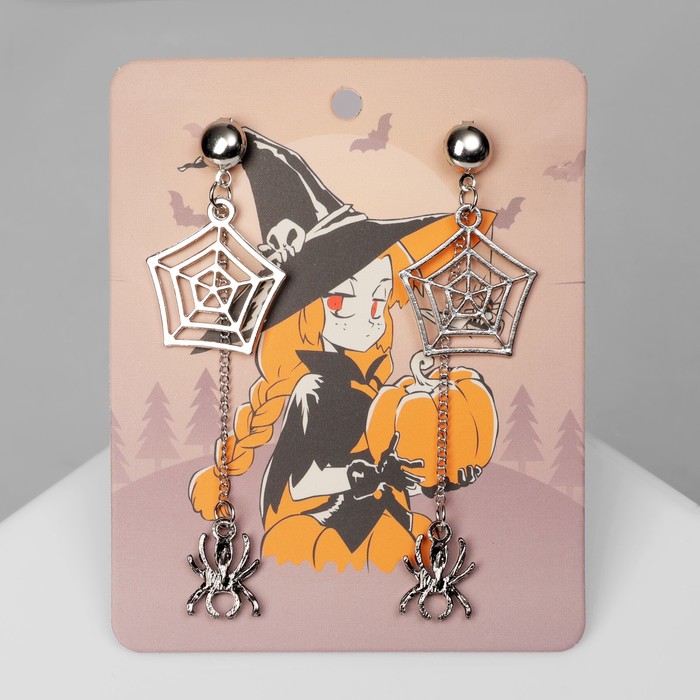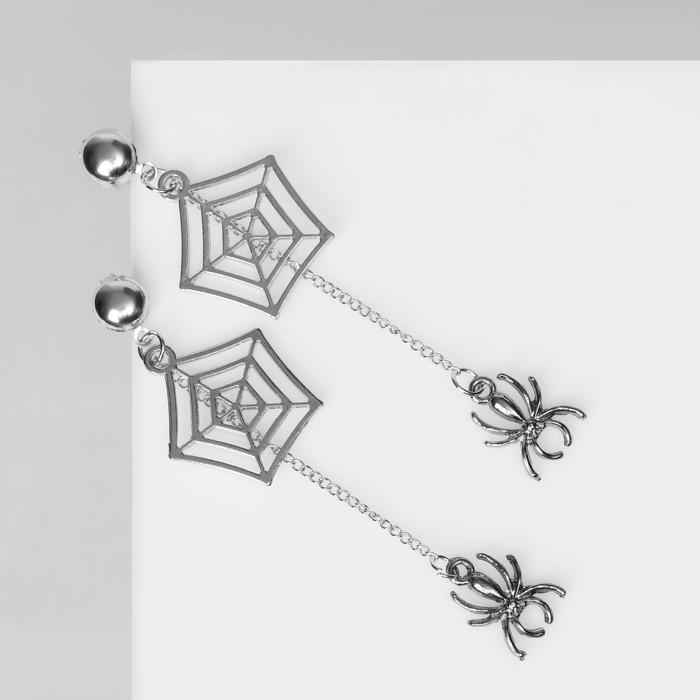 Серьги висячие «Пауки» с паутиной, цвет серый в серебре, 8 см — Характеристики