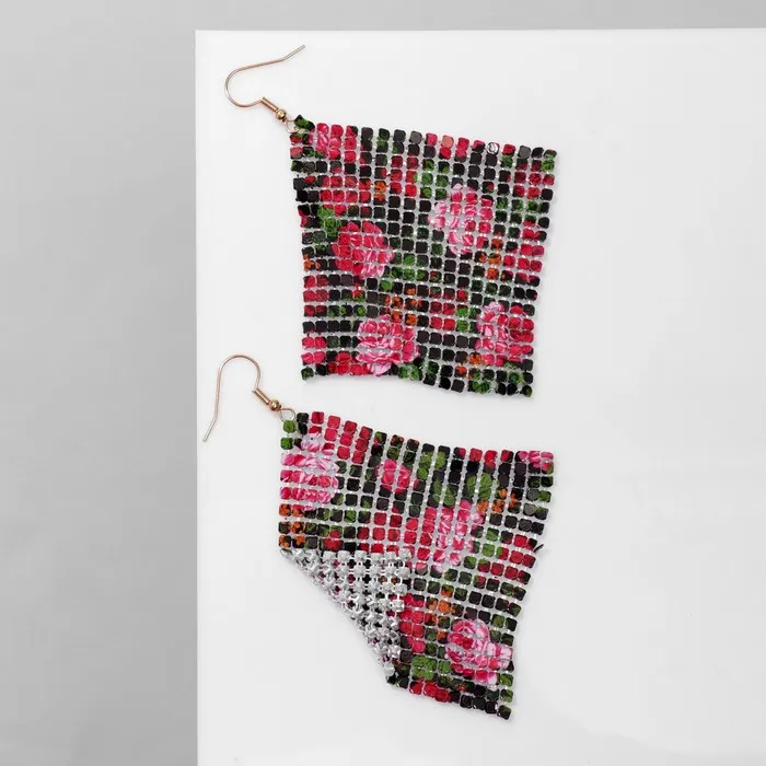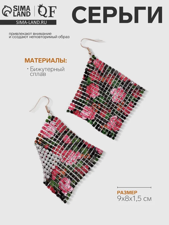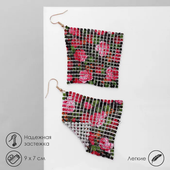 Серьги висячие «Ромб» кольчуга, цветы крупные, цветные, 9 см — Характеристики