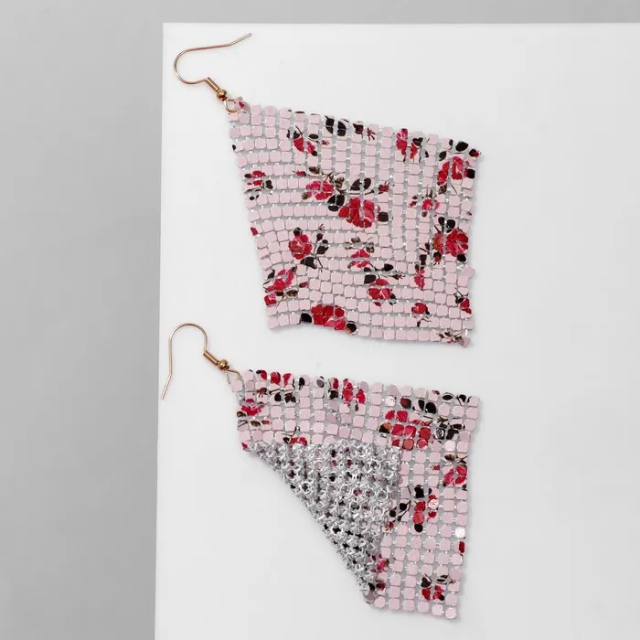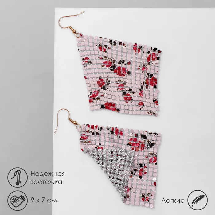 Серьги висячие «Ромб» кольчуга, цветы розы, цвет красно-розовый, 9 см — Характеристики