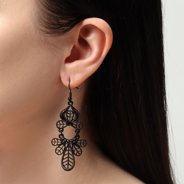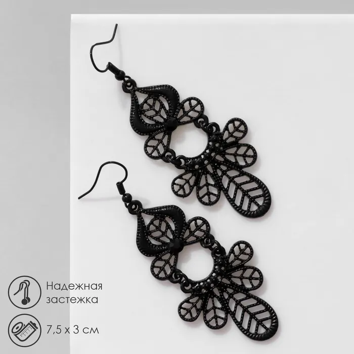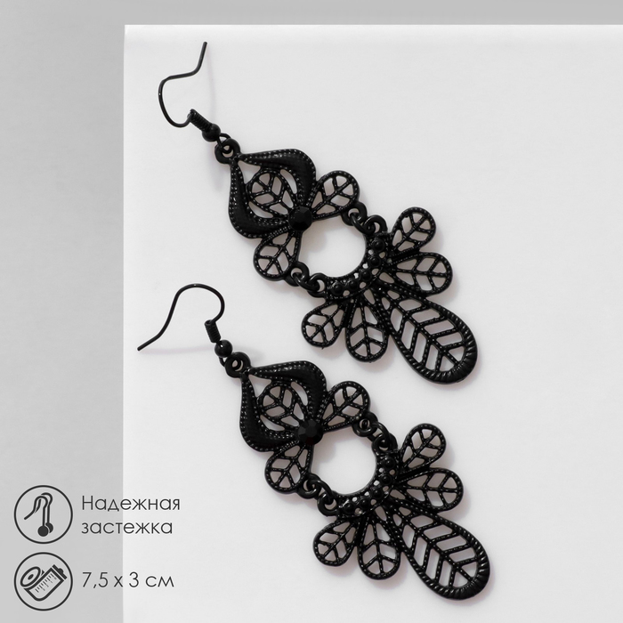 Серьги висячие со стразами «Ажур» листья, цвет чёрный в чёрном металле, 7,5 см — Характеристики