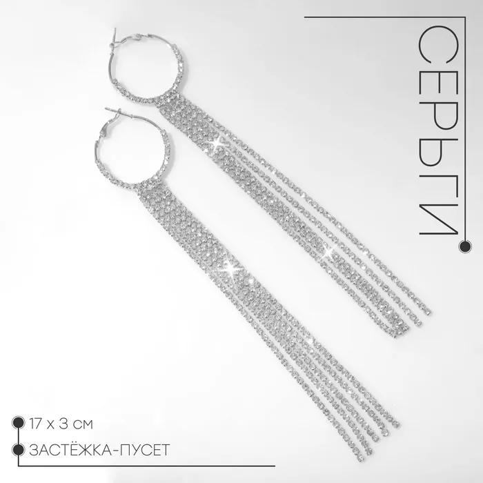 Серьги висячие со стразами «Голливуд» нити на кольцах, цвет белый в серебре, 17 см — Характеристики