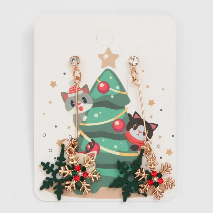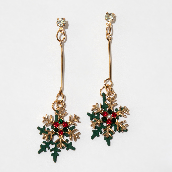 Серьги висячие со стразами «Новогодние» снежинки, цвет красно-зелёный в золоте — Характеристики