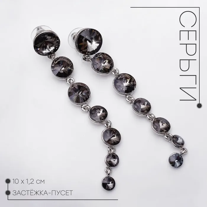 Серьги висячие со стразами «Роскошь» дорожка с кругами, цвет серый в серебре,10 см — Характеристики