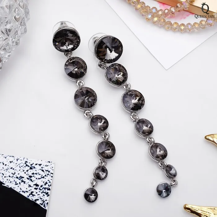 Эти висячие серьги длиной 10 см создают впечатление лёгкости и изящества благодаря сочетанию серебристой металлической основы и серых стеклянных страз, аккуратно выложенных в виде дорожки с кругами. Такой дизайн привлекает внимание своей оригинальностью и глубиной оттенков, подчёркивая утончённый вкус и индивидуальность обладательницы.