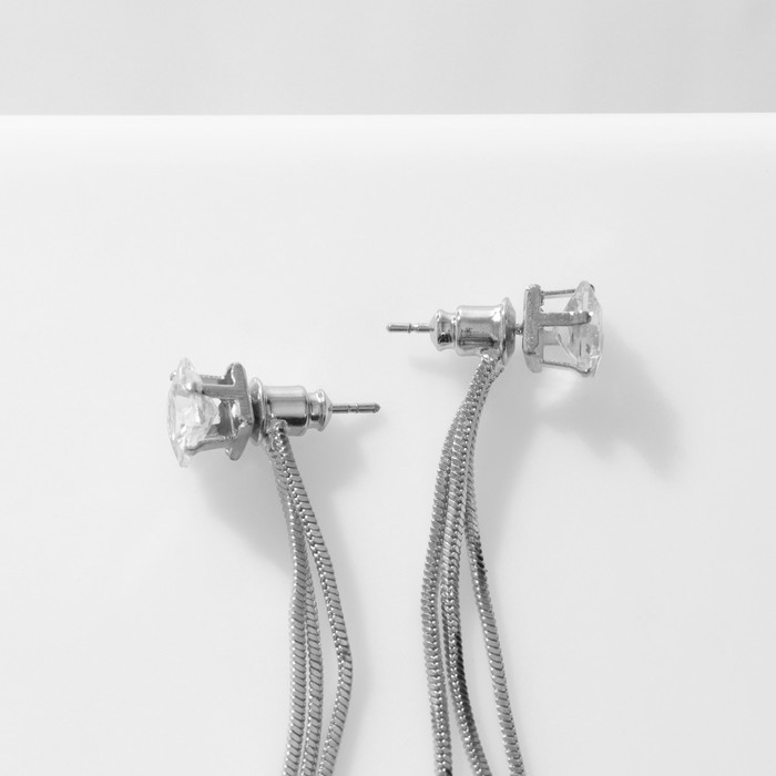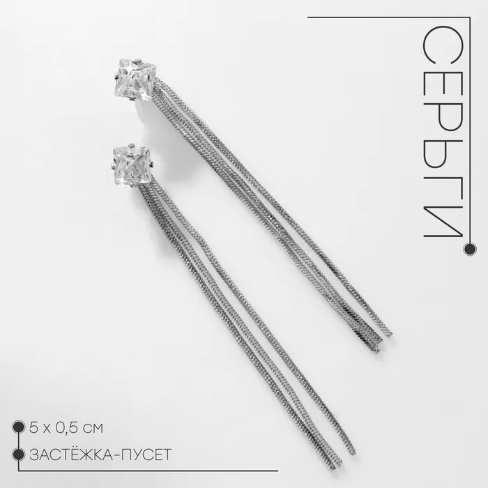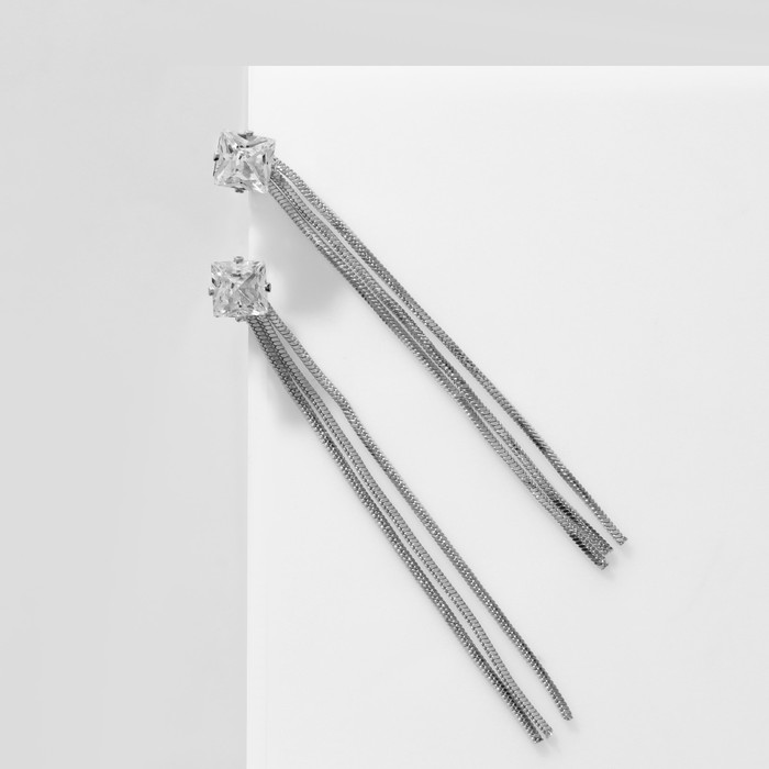 Серьги висячие со стразами «Цепочки» квадрат, цвет белый в серебре — Характеристики