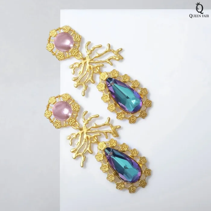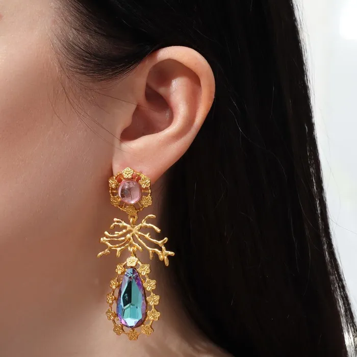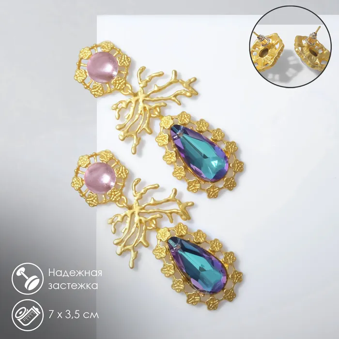 Серьги висячие со стразами «Цветение» сказочное, цветные в золоте, 7 см — Характеристики