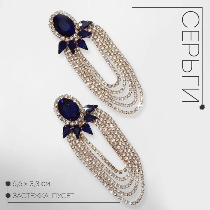 Серьги висячие со стразами «Вечеринка» 5 рядов, цвет сине-белый в золоте — Характеристики