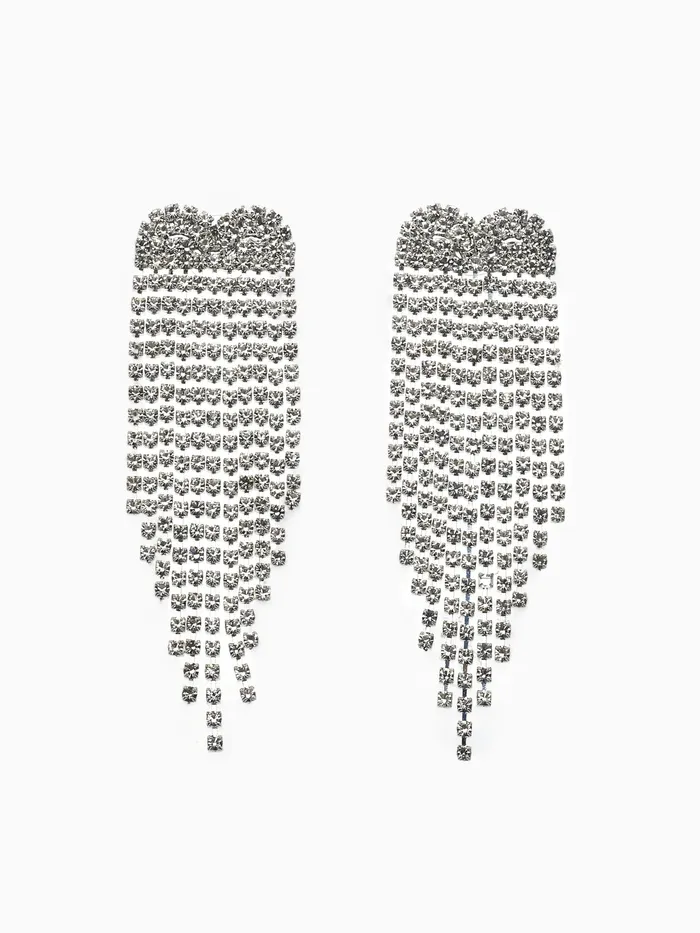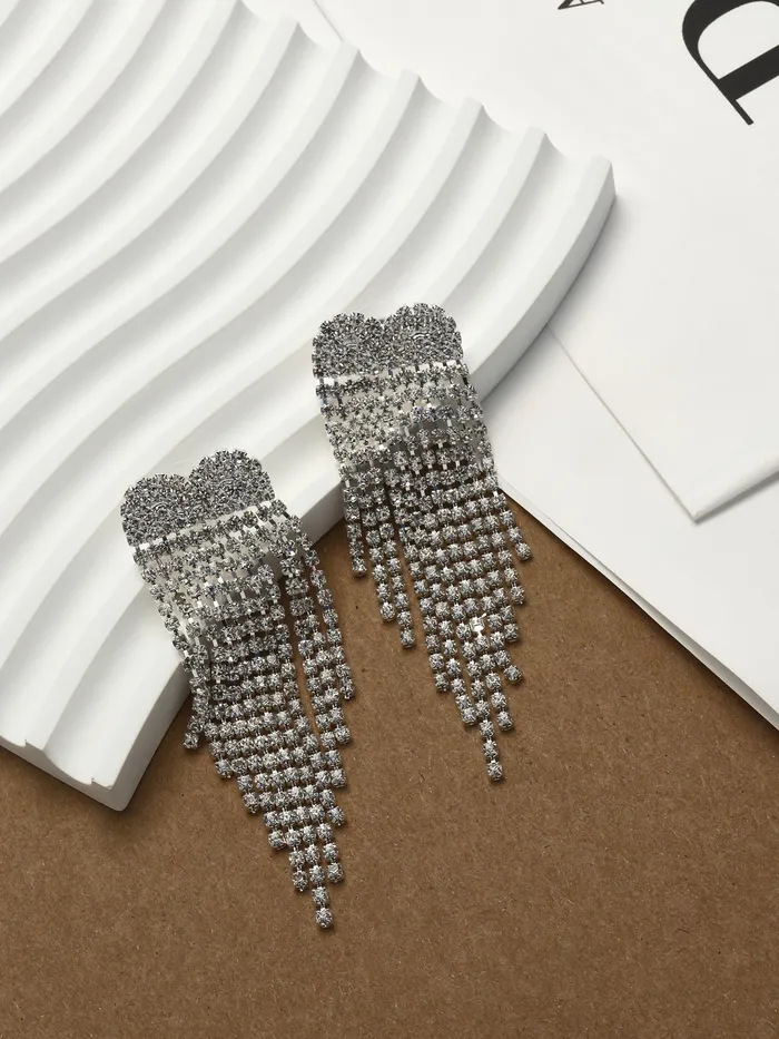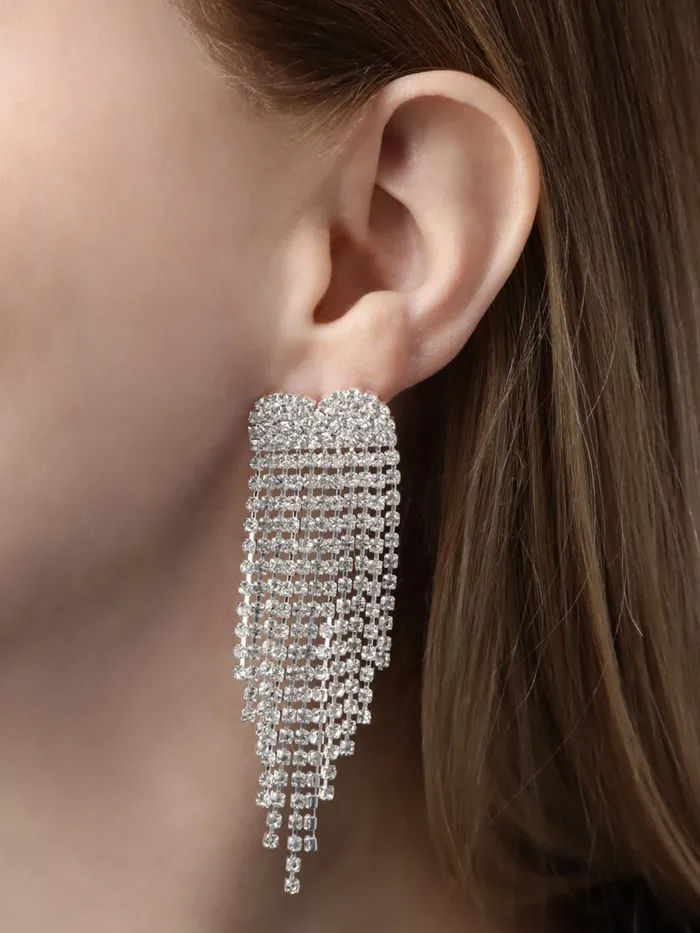 Откройте для себя изящество и романтику с этими великолепными висячими серьгами, оформленными в виде сердечек. Каждая деталь этих украшений выполнена с безупречным вниманием, а белые стразы, сияющие на свету, создают эффект вечного сияния, добавляя вашему образу нежности и утонченности.