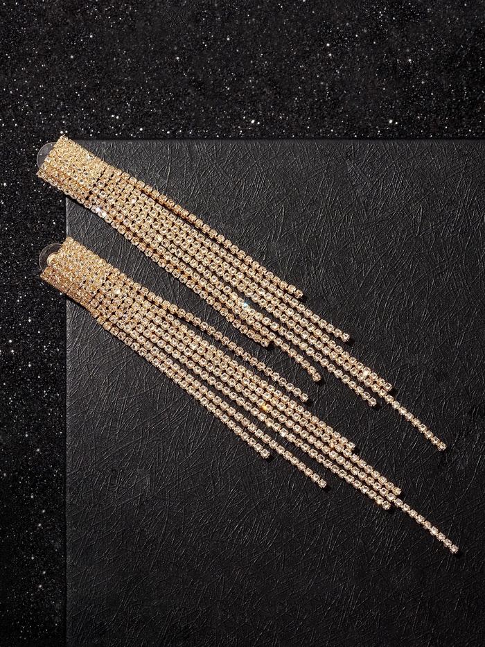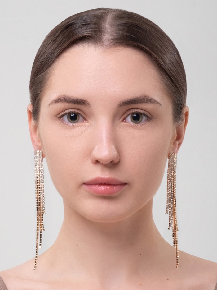 Вдохните жизнь в своё праздничное настроение с восхитительными длинными серьгами, переливающимися каскадом белых стразов на фоне мягкого золотистого покрытия. Подобно мерцающей реке света, они мягко спускаются вдоль шеи, создавая атмосферу сказочной красоты и классики одновременно.