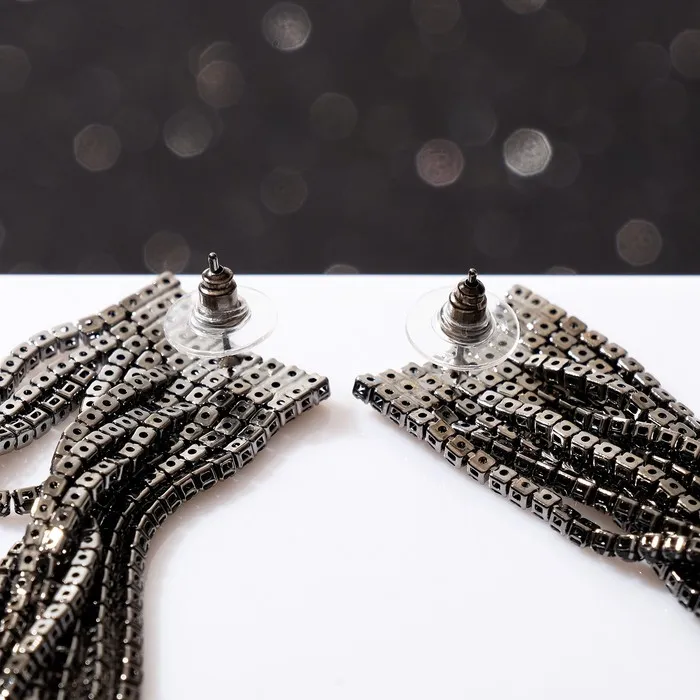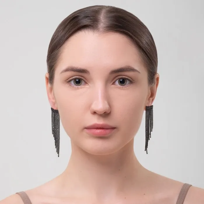 Подчеркните свою изысканность с великолепными висячими серьгами, которые словно завораживающий водопад, струятся и игриво переливаются под светом. Эти серьги длиной 8 см выполнены в стильном чёрном цвете с аккуратной серебристой фурнитурой, что делает их универсальным аксессуаром для любой женщины.