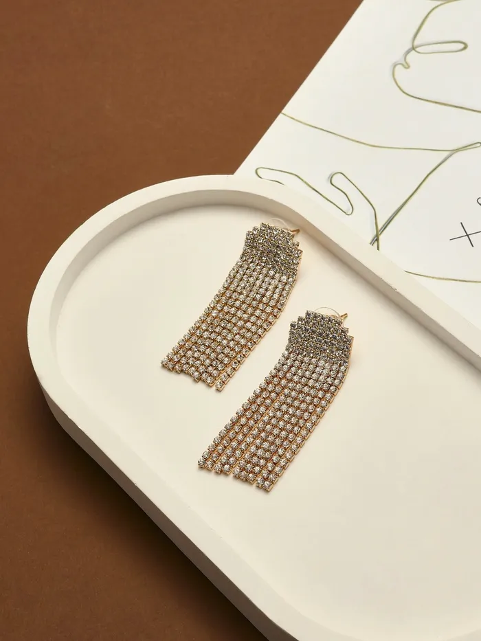 Представляем вам удивительное дополнение к вашей коллекции аксессуаров — висячие серьги, которые будто бы созданы для того, чтобы подчеркивать вашу утонченную красоту. Стразы белого цвета, изящно обрамленные в золотистую фурнитуру, создают образ, наполняющий любую атмосферу шармом и очарованием.