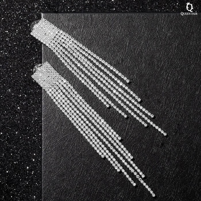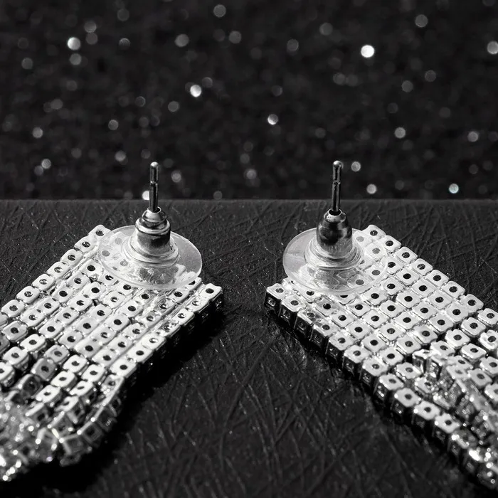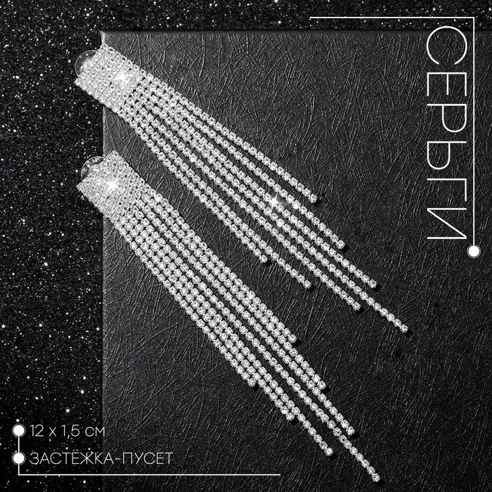 Серьги висячие со стразами «Водопад» на прямоугольнике, белые в серебре, 12 см — Характеристики