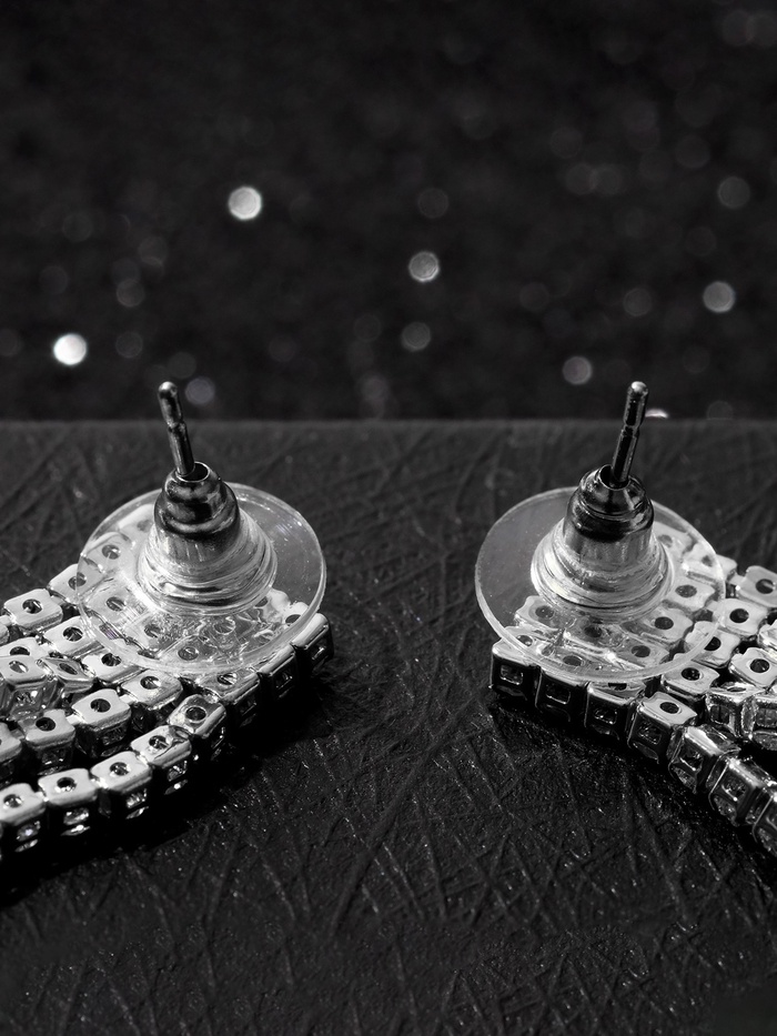 Изготовленные из качественного металла с серебряной фурнитурой, серьги излучают изысканность благодаря белым стразам, которые сверкают при каждом движении. Застёжка-пусет обеспечивает надёжную фиксацию, позволяя вам наслаждаться комфортом на протяжении всего дня, будь то свадьба, вечерний выход или повседневные дела.