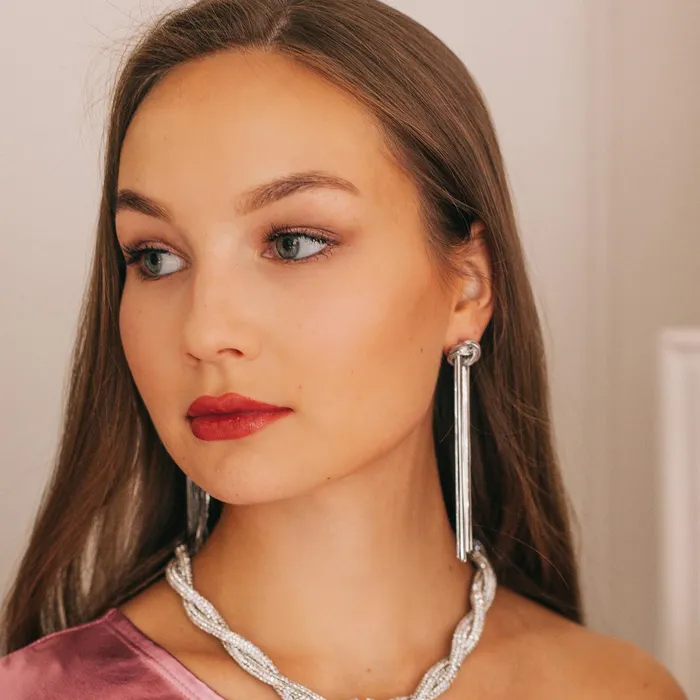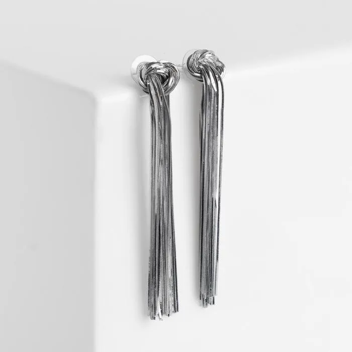 Легкость и динамика в каждом движении — эти висячие серьги длиной 12 см воплощают изящную абстракцию в серебристом металле. Их дизайн с узелком напоминает струящийся водопад, создавая эффект плавности и непрерывного движения, который привлекает внимание и подчеркивает индивидуальность.