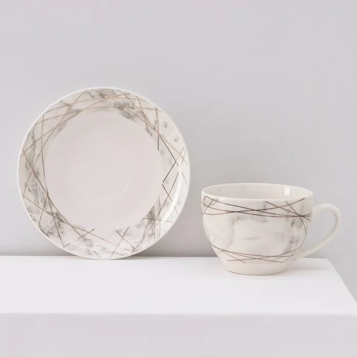 Чайный сервиз серии «Мрамор» - это не просто отличный подарок, но и замечательный предмет декора, дополняющий Ваш дом, наполняющий его гармонией и уютом. Изделия изготовлено из костяного фарфора - чрезвычайно износостойкого и прочного материала, что делает посуду идеальной для ежедневного использования. Фарфор покрыт специальной высокопрочной глазурью, благодаря которой,изделие надолго сохраняет свою новизну и не боится высоких температур.
