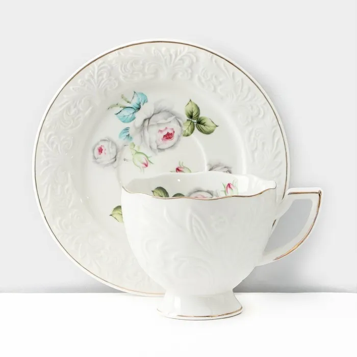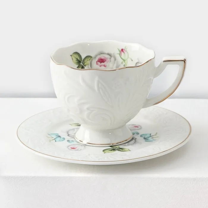 Чайный сервиз Rose изготовлен из качественного костяного фарфора. Специальный компонент в составе изделий делает их более прочными. Нежный дизайн, цветочный принт, тонкие ручки придают посуде утончённый вид.