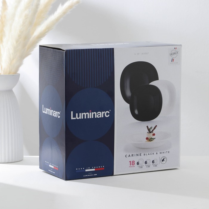 Столовый сервиз серии Carine White&Black включает 18 тарелок разных объёмов и диаметров. Данный вариант набора представлен в цветной фирменной коробке. Посуда Luminarc изготовлена из стеклокерамики и отличается высоким качеством. Благодаря оригинальному дизайну предметы украсят кухню и гостиную, дополнят тематическую фотосессию, придутся по душе гостям ресторанов и кафе.