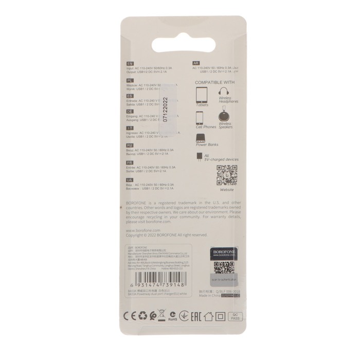 Сетевое зарядное устройство Borofone BA53A, 2xUSB, 2.1 А, белое — Характеристики