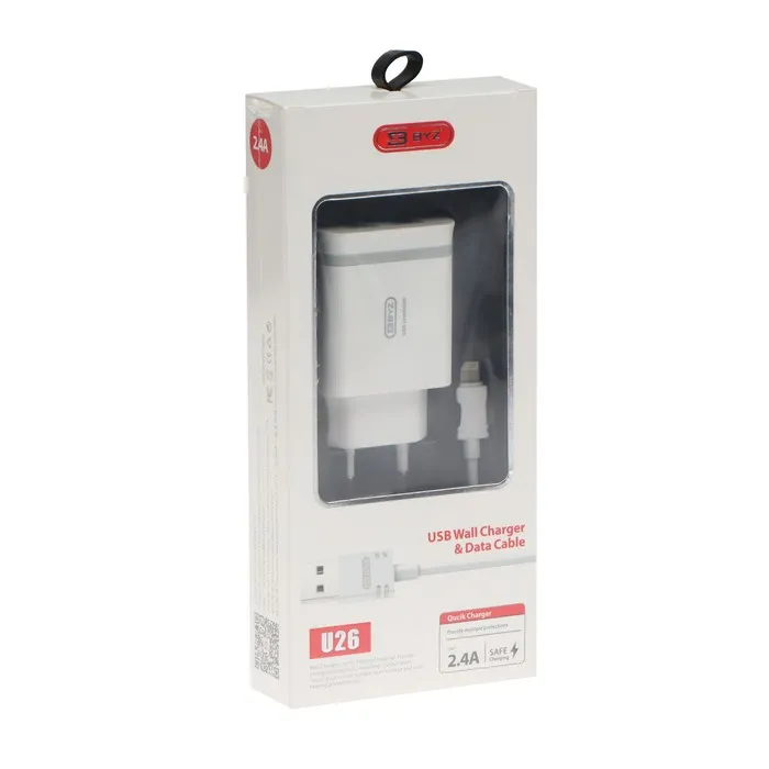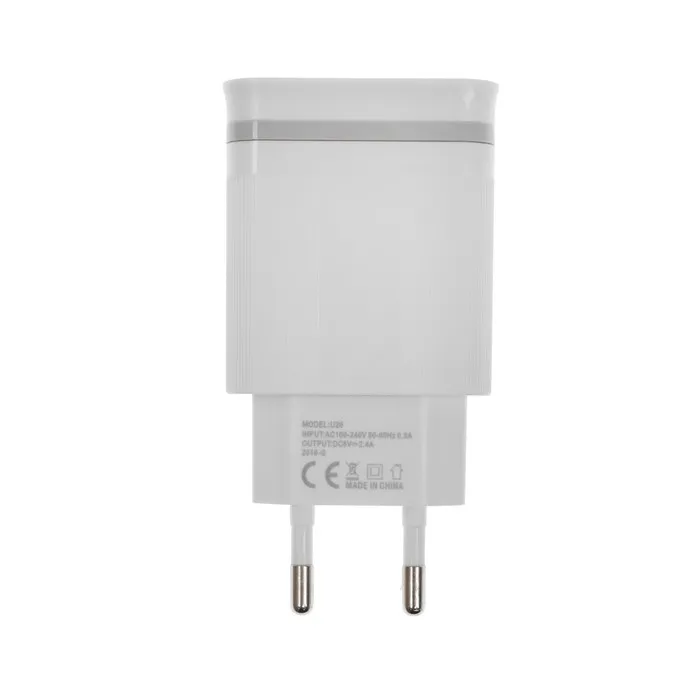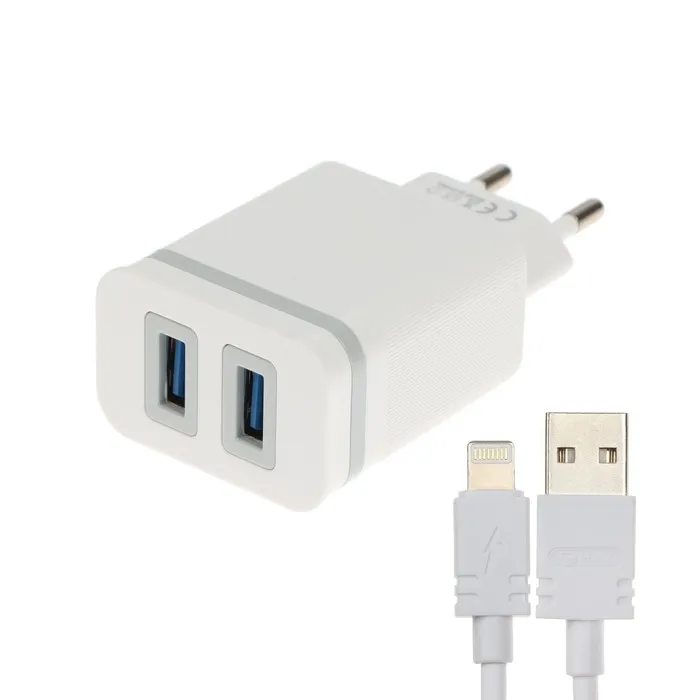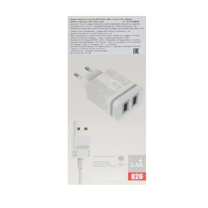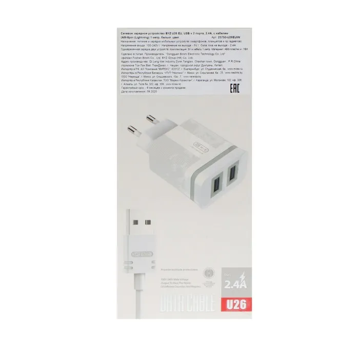 Сетевое зарядное устройство BYZ U26 EU, 2 USB, 2.4 A, кабель Lightning 1 м, белое — Характеристики
