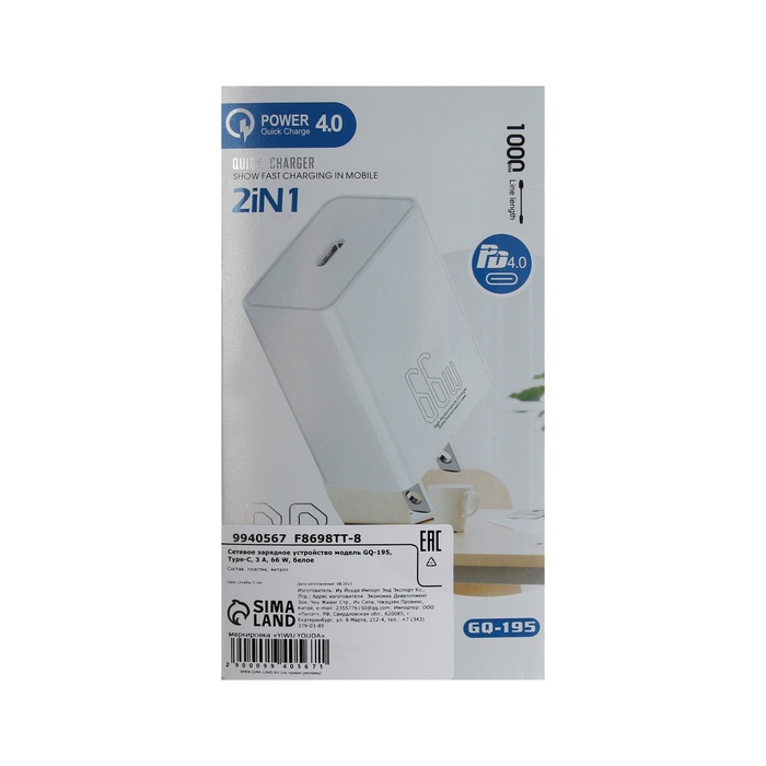 Сетевое зарядное устройство GQ-195, Type-C, 3 A, 66 W, белое — Характеристики