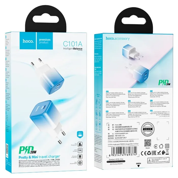 Сетевое зарядное устройство Hoco C101A, 1 Type-C, 20 Вт, PD + QC, синий — Характеристики