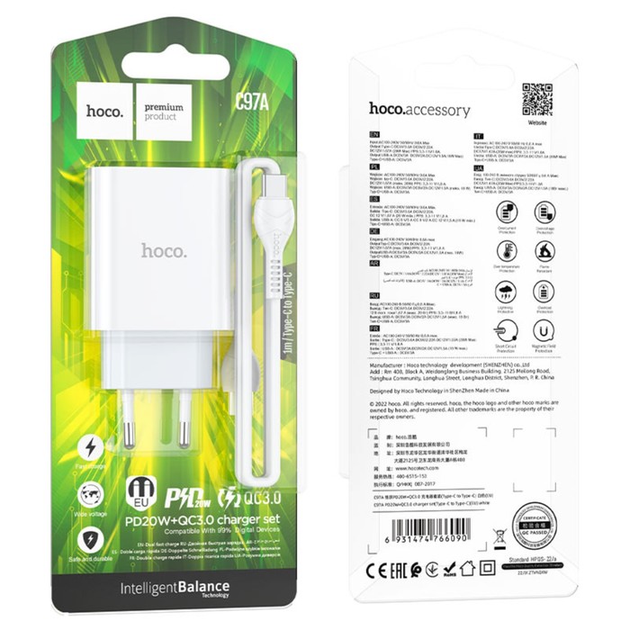 Сетевое зарядное устройство Hoco C97A, USB, Type-C, 20 Вт, Type-C - Type-C, 1 м, белое — Характеристики