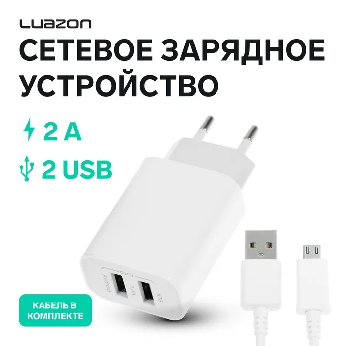 Сетевое зарядное устройство Luazon LCC-96, 2 USB, 2 A, кабель microUSB, белое — Характеристики