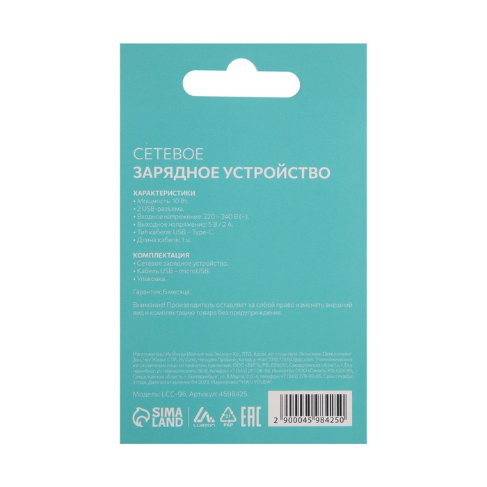 Сетевое зарядное устройство Luazon LCC-96, 2 USB, 2 A, кабель Type-C, белое — Характеристики