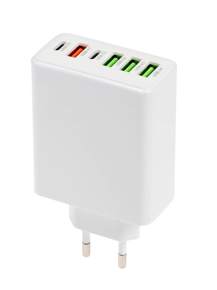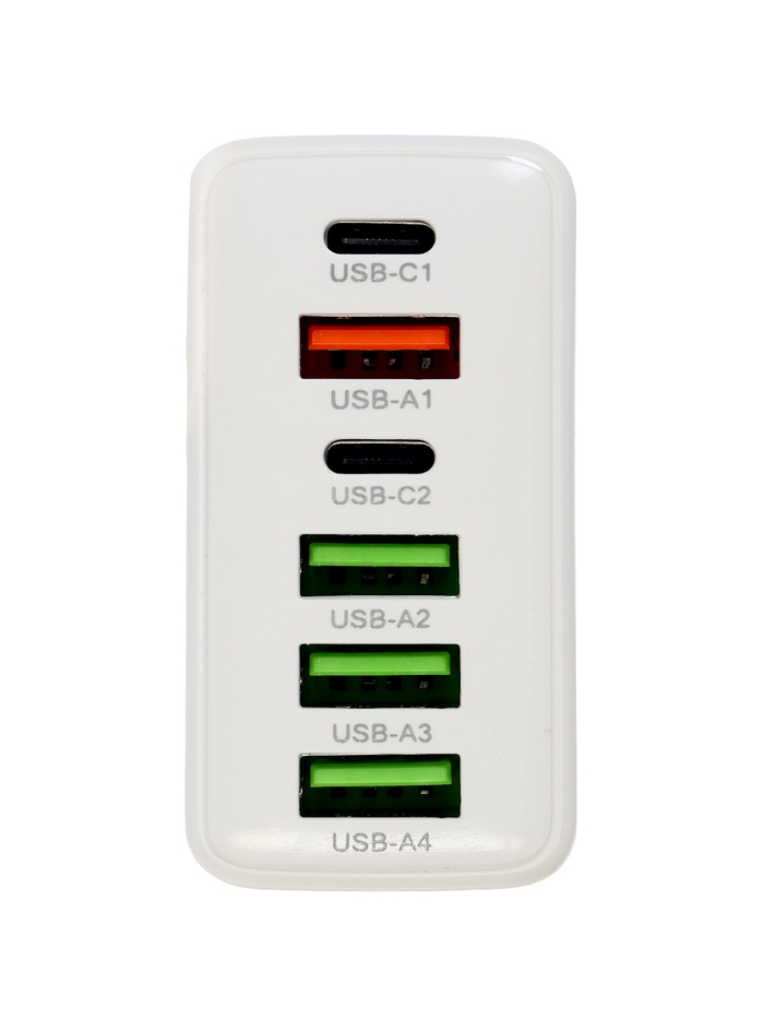 - Множество портов: Устройство оснащено четырьмя USB Type-A и двумя Type-C портами, что позволяет заряжать до шести устройств одновременно.
