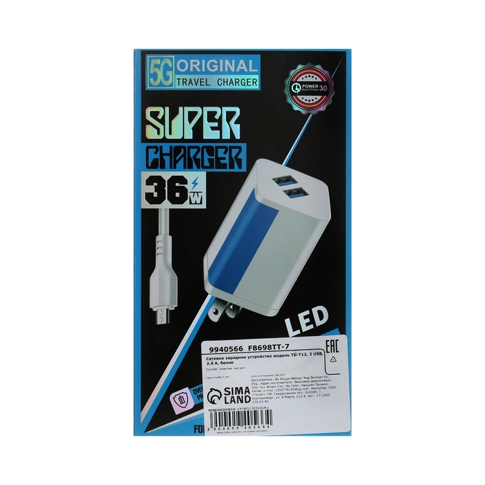 Сетевое зарядное устройство TD-T12, 2 USB, 2.4 А, белое — Характеристики