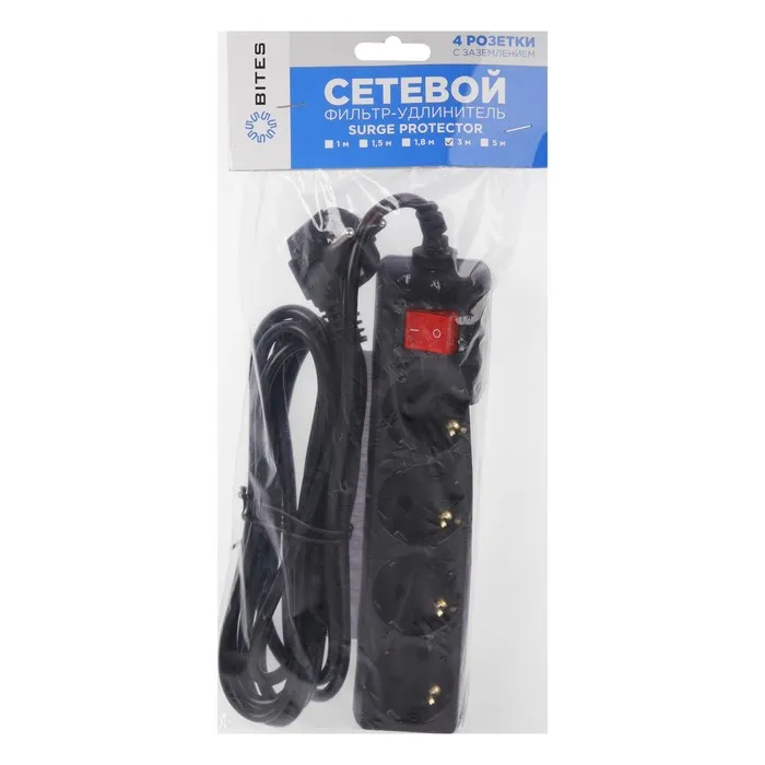 Сетевой фильтр 5bites SP4B-230 4S, 4 розетки, 3 м, 10 А, 3х0.75 мм2, с з/к, с выкл., черный