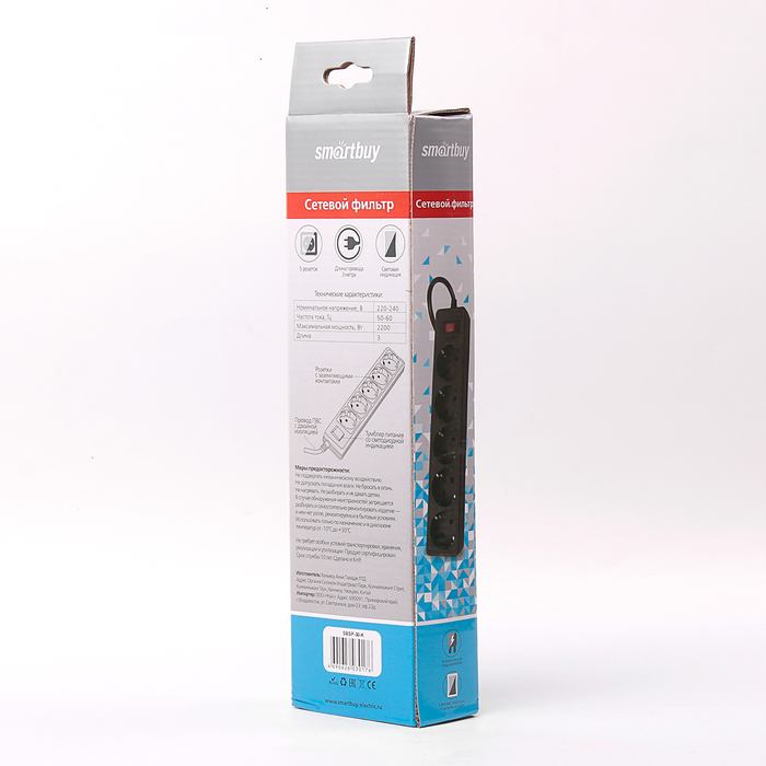 Сетевой фильтр Smartbuy One, 5 розеток, 3 м, 10 А, 2200 Вт, с заземлением, чёрный — Характеристики
