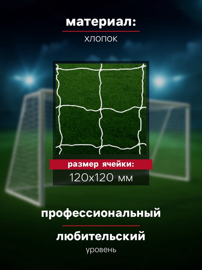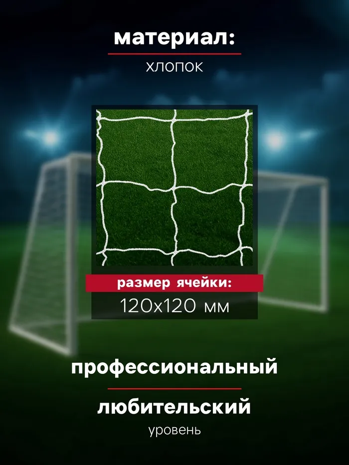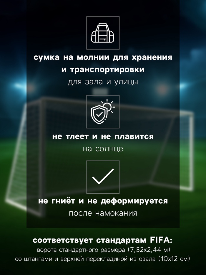 Футбольная сетка подходит для ворот стандартного размера (7,32 х 2,44 м), со штангами и верхней перекладиной из овала (10 х 12 см) (стандарт FIFA).