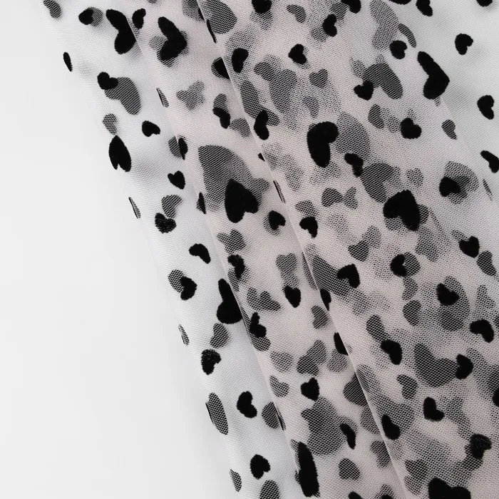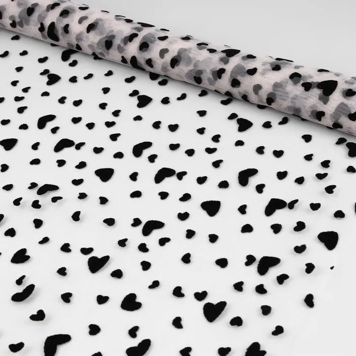 Сетка с флоком «Сердечки» сочетает в себе элегантность и приятную текстуру. Благодаря своей лёгкости и прозрачности она используется для создания объёмных воздушных дизайнов, романтических нарядов, аксессуаров, декоративных элементов или костюмов.