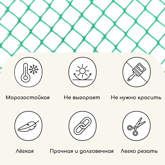 Сетка садовая, 1.5×10 м, ячейка 15×15 мм, пластиковая, зелёная, Greengo, в рулоне — Характеристики