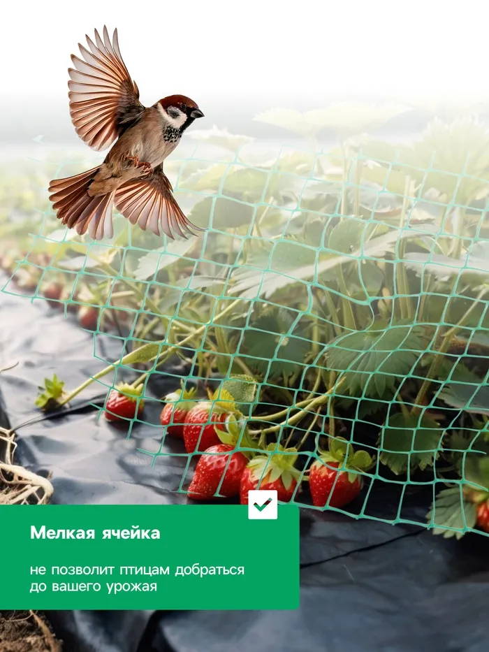 Сетка сохраняет урожай от птиц и защищает молодые ростки. Изготовлена из прочного пластика.
