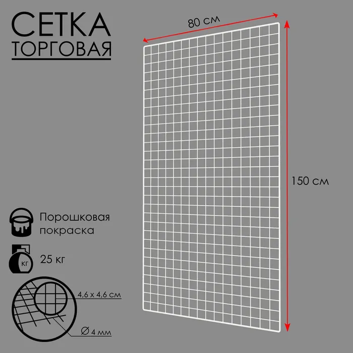 Торговая сетка размером 80×150 см с окантовкой 6 мм и прутком диаметром 4 мм — идеальный выбор для организации торговых пространств, выставок или магазинов. Она предназначена для размещения товаров, создания перегородок или использования в качестве стеллажной системы на стенах.