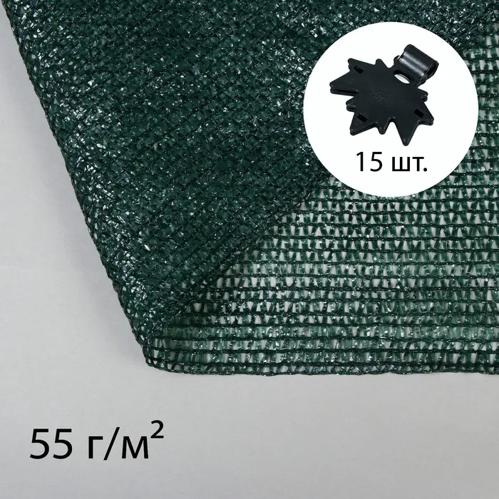 Сетка затеняющая, 5×2 м, плотность 55 г/м², зелёная, в наборе 15 клипс — Характеристики