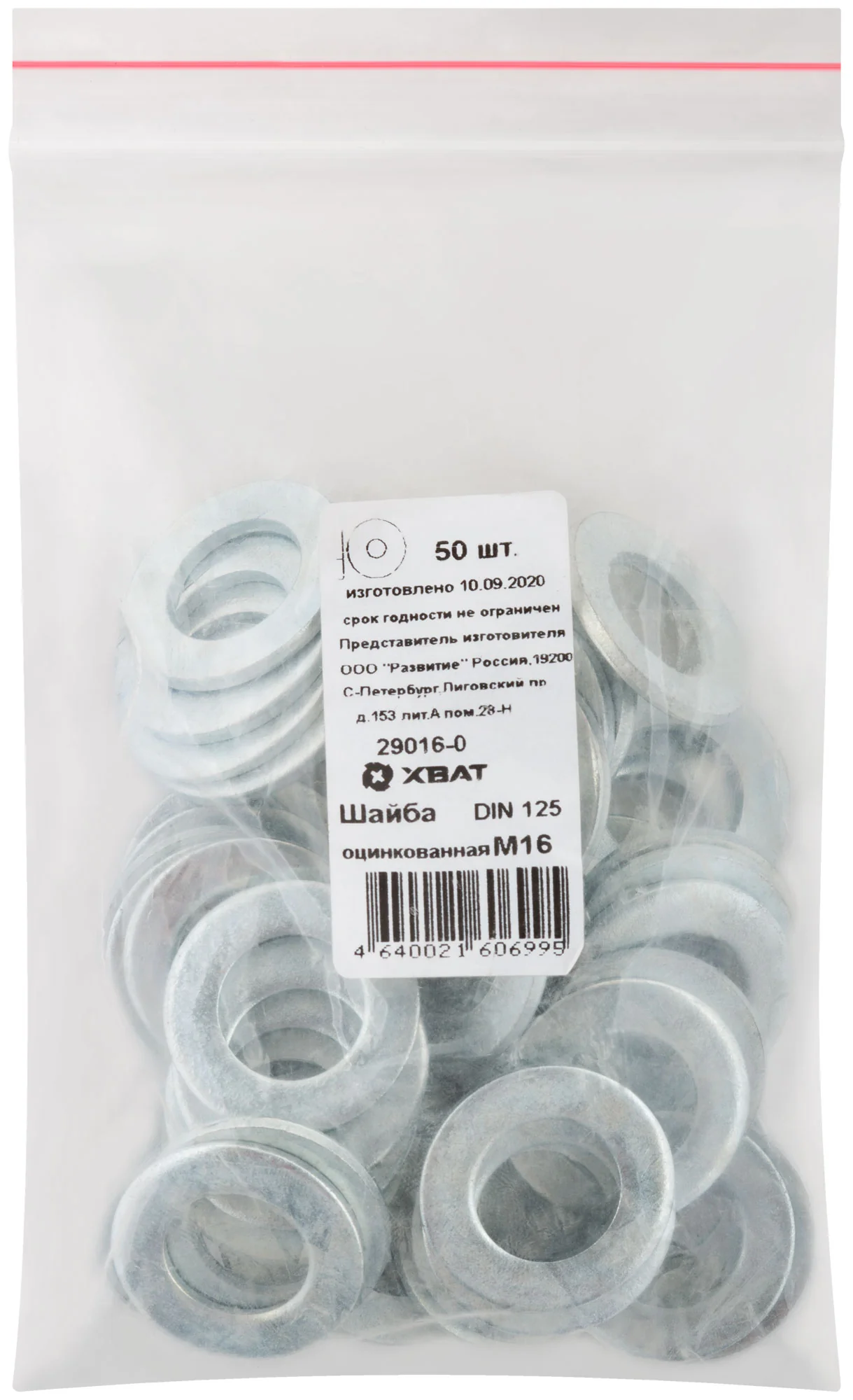 Шайба изготовлена из конструкционной стали с оцинкованным покрытием, что гарантирует защиту от коррозии и долговечность. Типоразмер М16 соответствует стандарту DIN 125 и подходит для широкого спектра крепежных задач.