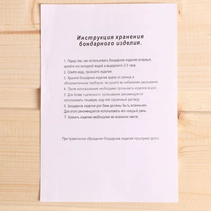 3. Храните бондарное изделие вдали от солнца и обогревательных приборов, не сушите во избежание рассыхания;
